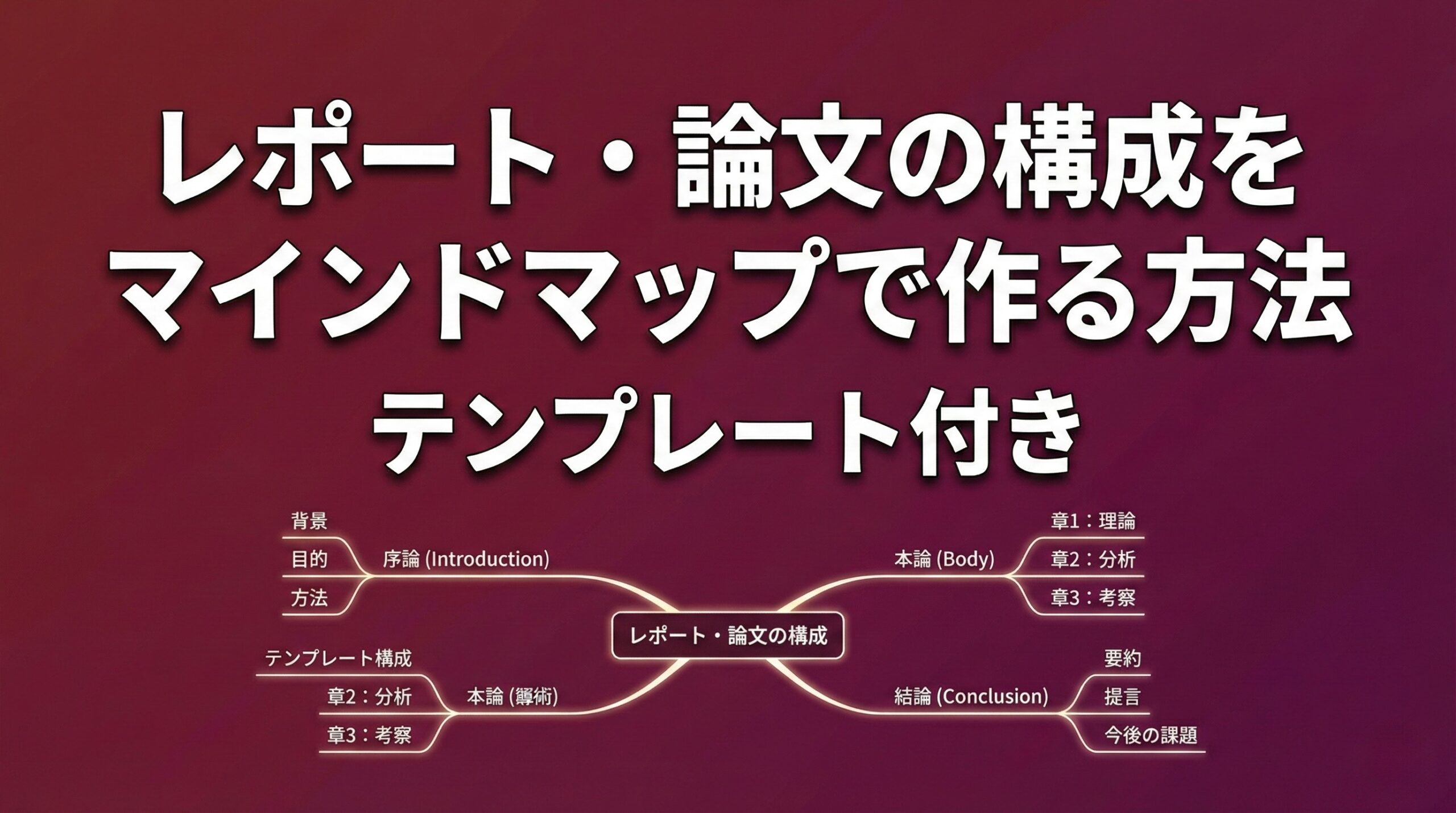 レポート・論文には、説得力を生む「型」があります。この型をマインドマップで可視化することで、論理的な構成が自然に作れます。