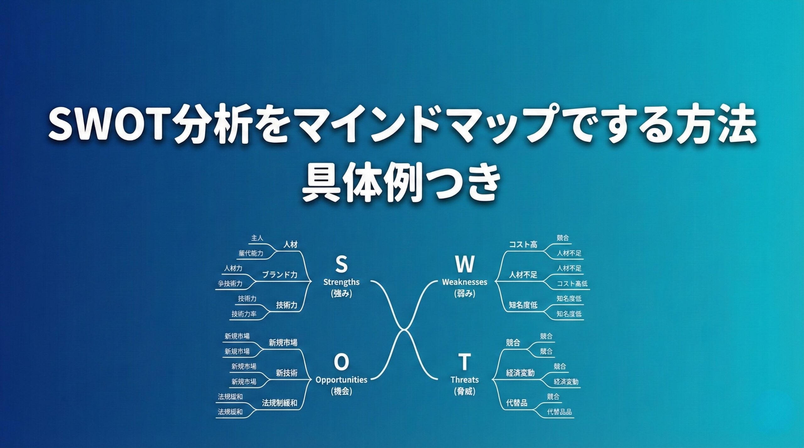 この記事では、SWOT分析をマインドマップで整理する方法を紹介する。要素を洗い出すだけでなく、根拠と施策まで一気通貫で可視化できる型を使えば、分析が「使える戦略」に変わる。